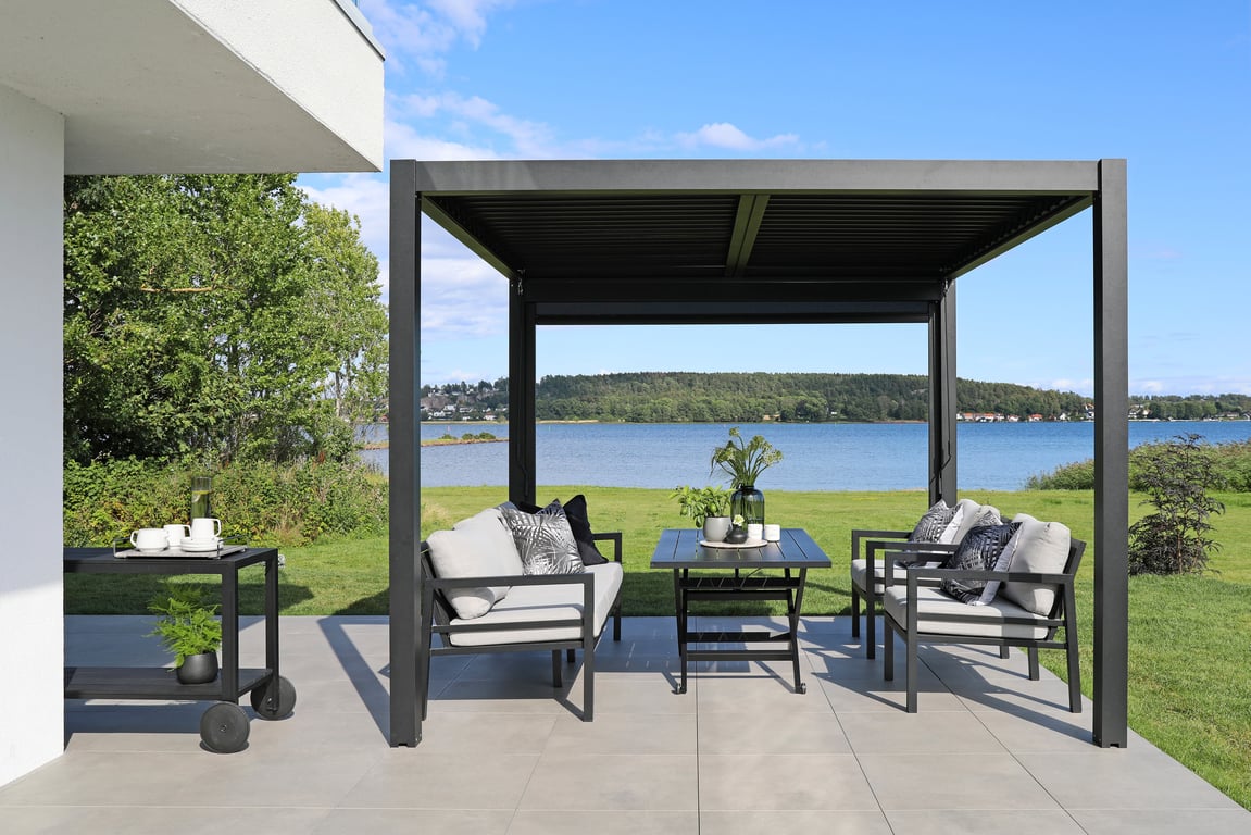 | Egenskaper | Stilren. Vedlikeholdsvennlig. Vridbare lameller i tak beskytter mot sol. Bygg på med én eller flere vegger for å redusere vind eller innsyn. |