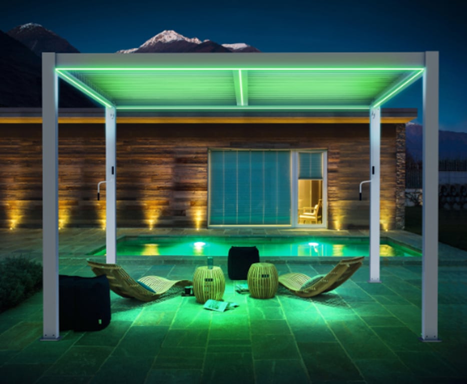 | Detaljer | LED, RGB. Velg pergola etter ditt uteområde. Pergola finnes i 3x3 og 3x4 meter, i hvitt og sort, samt 4x4, 3x6 og 4x6 m i sort. Alle våre pergolaer har justerbart tak og mulighet for å bygge på med manuelle eller elektriske vegger. |