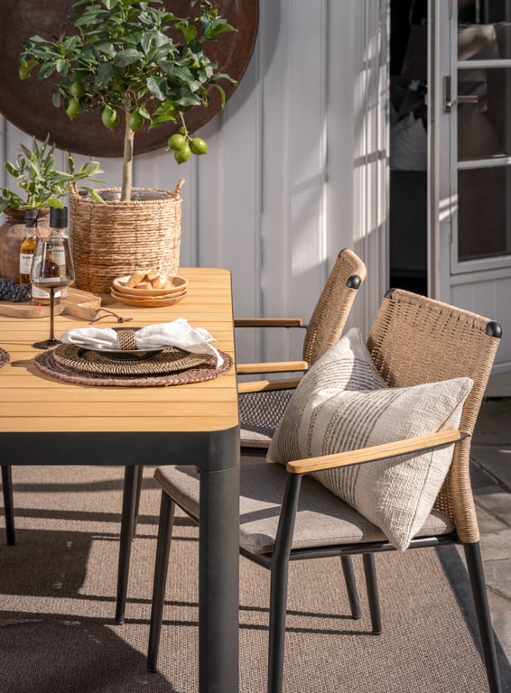 | Detaljer | Svart aluminium, Tvist rotting og Sisal putefarge. L56 D60 H82,5 FSC-godkjent teak på armlen |