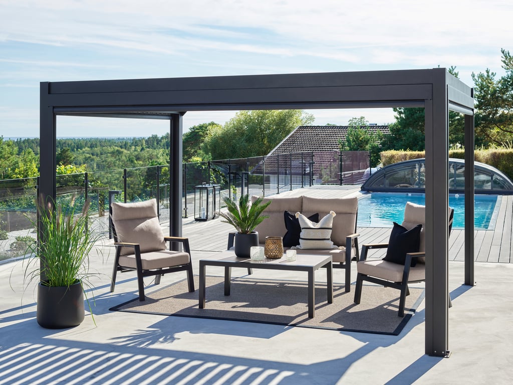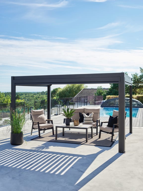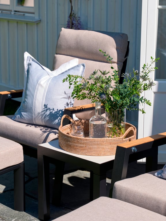 | Detaljer | Ramme i svart pulverlakkert aluminium m/FSC-godkjent teak på armlener, vaniljefargede puter i Olefin. |