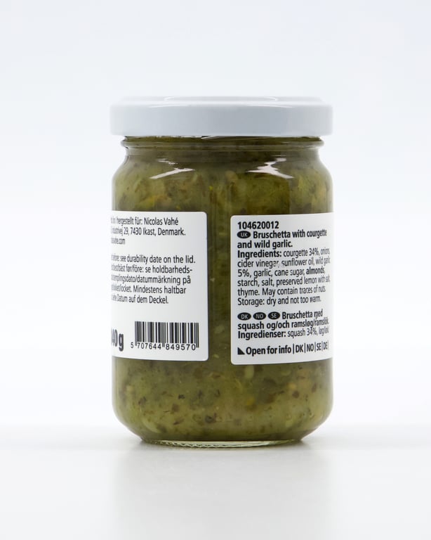 | Detaljer | Squash 34%, løk, eplesidereddik, solsikkeolje, ramsløk 5%, hvidløk, rørsukker, @mandler, stivelse, salt, konservert sitron med salt, timian. |