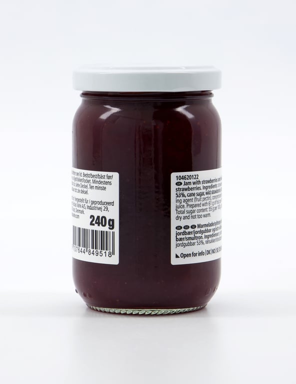 | Detaljer | Jordbær 53%, rørsukker, ville jordbær 8%, geleringsmiddel fruktpektin, konsentrert sitronsaft. |