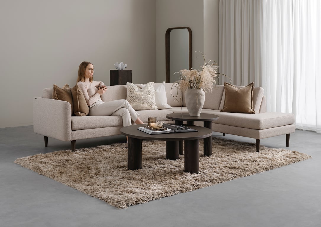 Hjellegjerde Høy hjørnesofa3 seter + stort hjørne + endemodul, armlen 28, stoff Domino light beige
